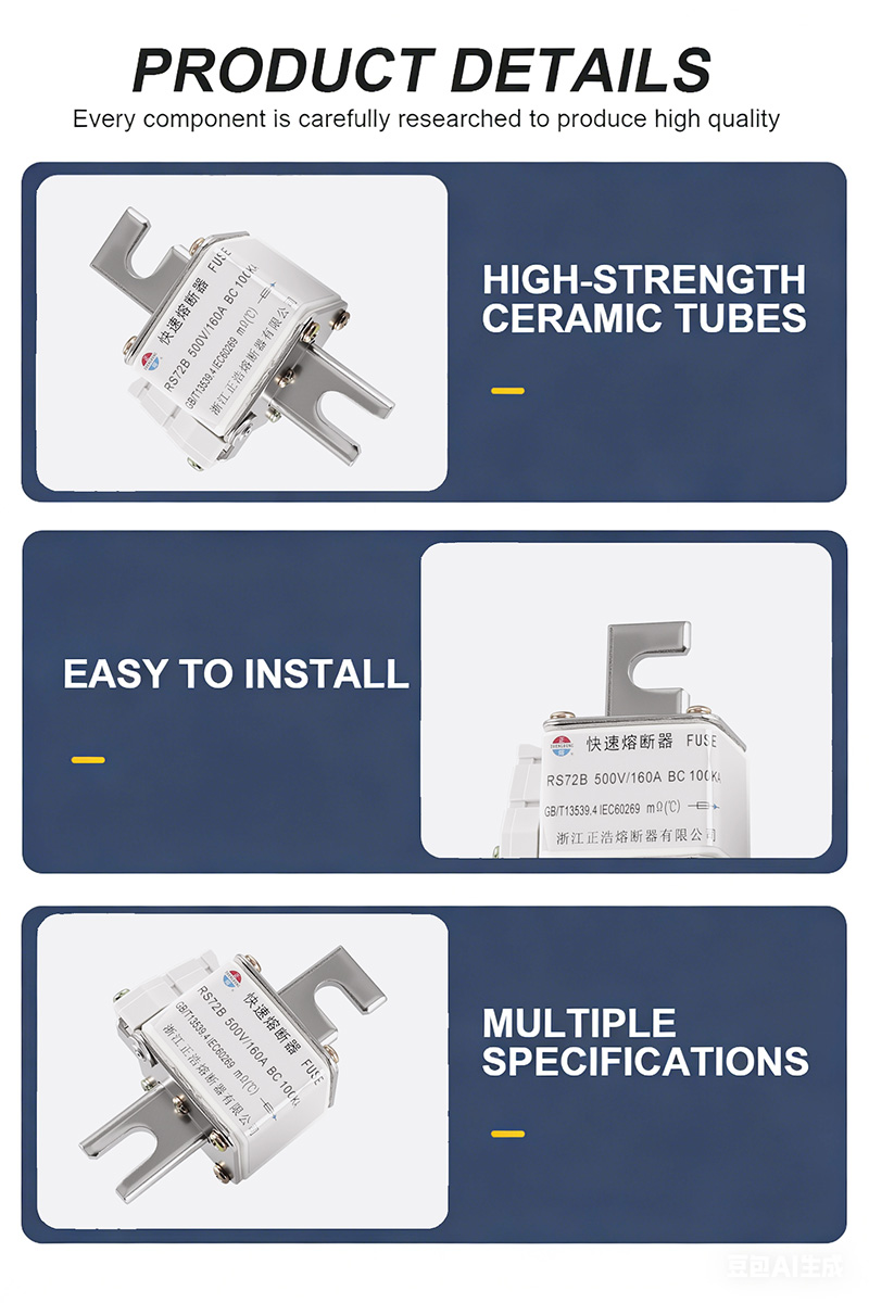 RS72B 500V 160A BC 100KA Fuse Links என்பது உயர் மின்னழுத்தம் மற்றும் உயர் மின்னோட்டப் பாதுகாப்பிற்காக வடிவமைக்கப்பட்ட உயர் செயல்திறன் கொண்ட தொழில்துறை உருகி ஆகும். RS72B 500V 160A BC 100KA ஃபியூஸ் இணைப்புகள் உயர்தர பொருட்களால் ஆனது மற்றும் சிறந்த உடைக்கும் திறன் கொண்டது. இது 100KA இன் அதிகபட்ச ஷார்ட்-சர்க்யூட் மின்னோட்டத்தைத் தாங்கும், இது உபகரணங்கள் சேதத்தைத் திறம்பட தடுக்கிறது.