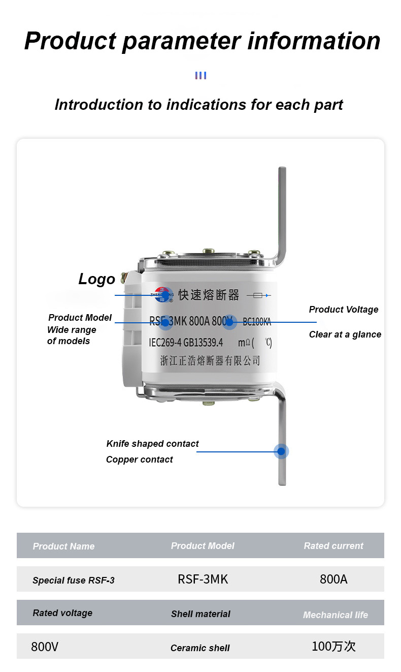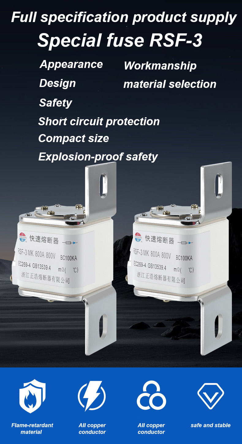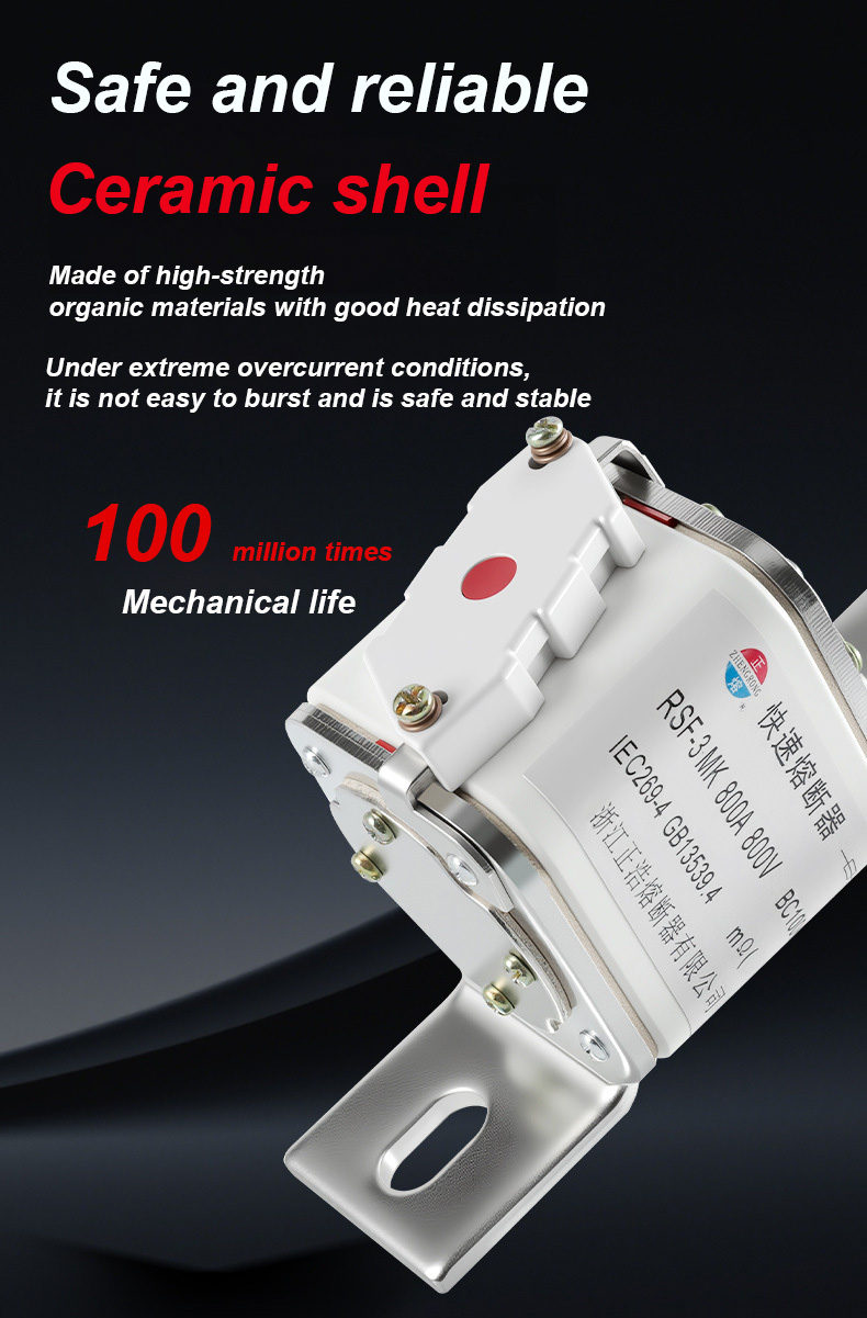 500V மின்னழுத்தம் மற்றும் 315A மதிப்பிடப்பட்ட மின்னோட்டத்தைக் கொண்டுள்ளது, இது மின் பாதுகாப்பை திறம்பட உறுதிப்படுத்துகிறது, அதிக சுமை மற்றும் குறுகிய சுற்று ஆகியவற்றைத் தடுக்கிறது. RSF-3MK 800V-800A BC100KA உருகி இணைப்புகள்